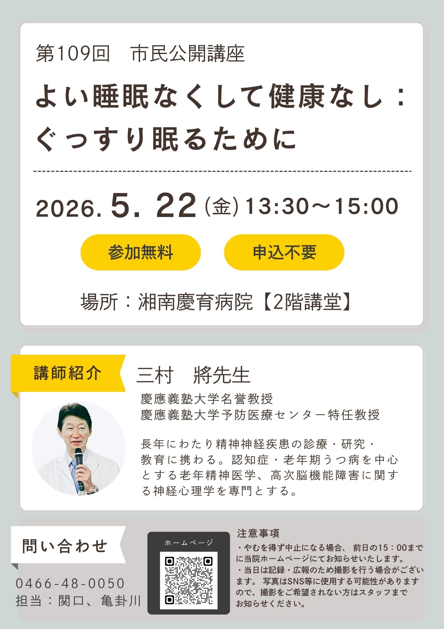 5月22日市民公開講座:「よい睡眠なくして健康なし:ぐっすり眠るために」