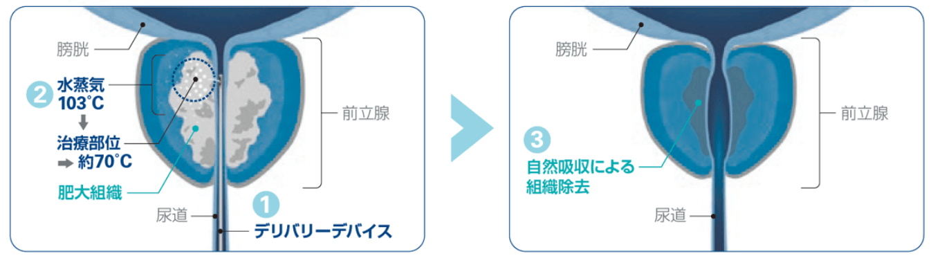 内視鏡を尿道内に挿入し、内視鏡先端から特殊な穿刺針を肥大した腺腫内に留置し、そこから噴霧された水蒸気の熱エネルギーにより、細胞が時間の経過とともに自然に縮小することで排尿障害が改善されます。